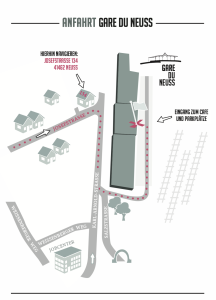 Nehmen Sie die A57 Richtung Krefeld und fahren Sie „Neuss/Hafen“ von der Autobahn auf die B1 ab. Verlassen Sie die B1 nach ca. 500 Metern in Richtung „Neuss/Hafen“ und biegen dann am Ende der Abfahrt an der Kreuzung links in die Stresemannstraße ein. Hier fahren Sie rechts an der Tankstelle vorbei und direkt auf die Langemarckstraße. Am Ende der Strasse fahren Sie an der Ampel links auf die Hammer Landstraße. Diese fahren sie bis zum Ende durch und biegen dann rechts ab um auf die Batteriestraße zu gelangen. Fahren Sie die Strasse bis zur Ampel durch und biegen dann links auf die Düsseldorfer Strasse ab. Dann biegen sie die erste Möglichkeit rechts ab und dann sofort wieder rechts. Nach einigen Metern finden sie den „Gare du Neuss“ auf der rechten Seite.